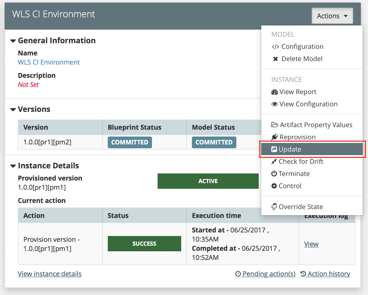 Firstly, we Update our environment with the new node details. This is an option under the Actions menu for our Platform Instance.